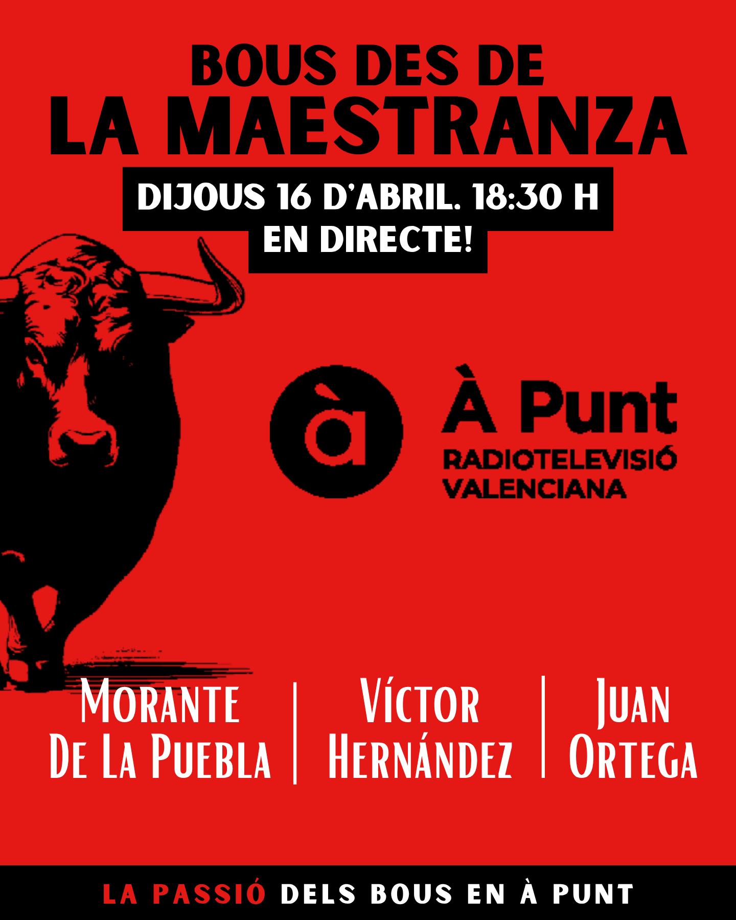 La radiotelevisión valenciana continúa apostando firmemente por la tauromaquia con las retransmisiones de los grandes eventos de la temporada taurina, tras la buena acogida por parte de la audiencia que han tenido en marzo las corridas de Castellón y Valencia. La información taurina se complementa cada semana con el programa La plaça, presentado por Jorge Casals, que se emite cada sábado a las 13:00 h, y en À Punt Ràdio se puede escuchar cada viernes a las 18:00 h Terra de bous, presentado por Germà Estela.