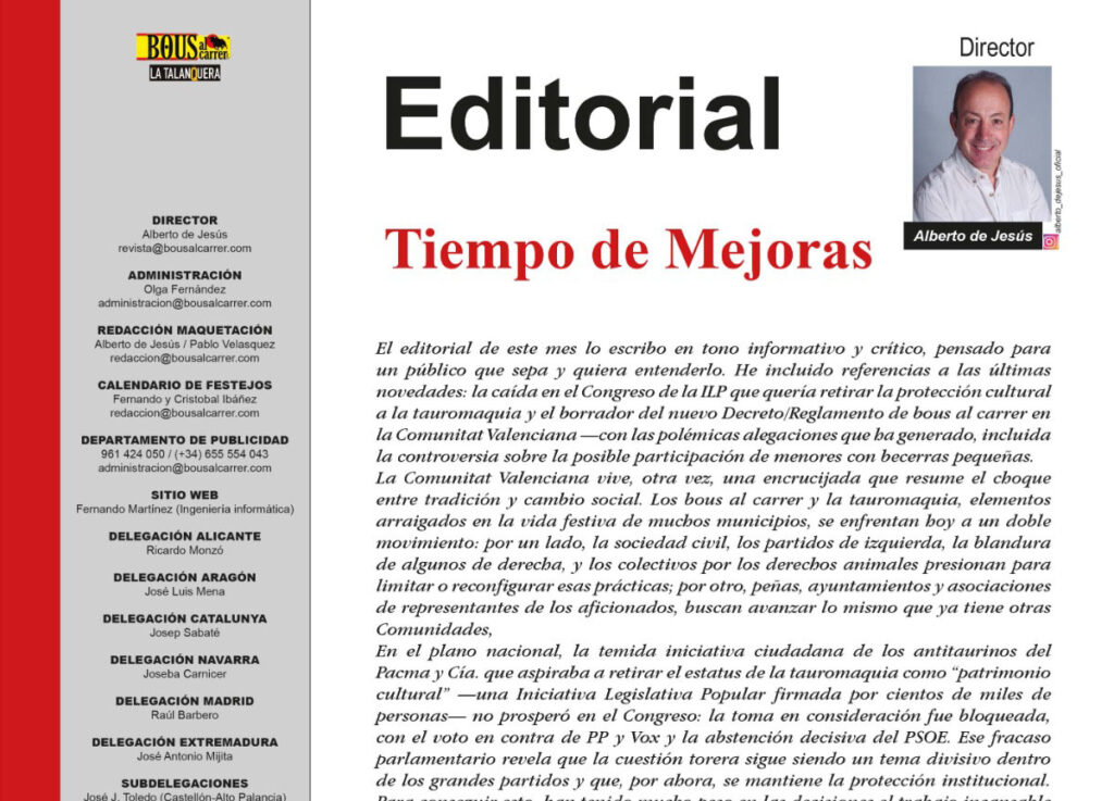 Editorial de nuestro director Alberto de Jesús en la revista de febrero: Enero suele ser un mes tranquilito en cuanto a actividades taurinas, pero las circunstancias han hecho que este haya sido intenso por las decisiones que han sucedido entorno al toro y las celebraciones o no, de Bous al Carrer en las calles.No seré